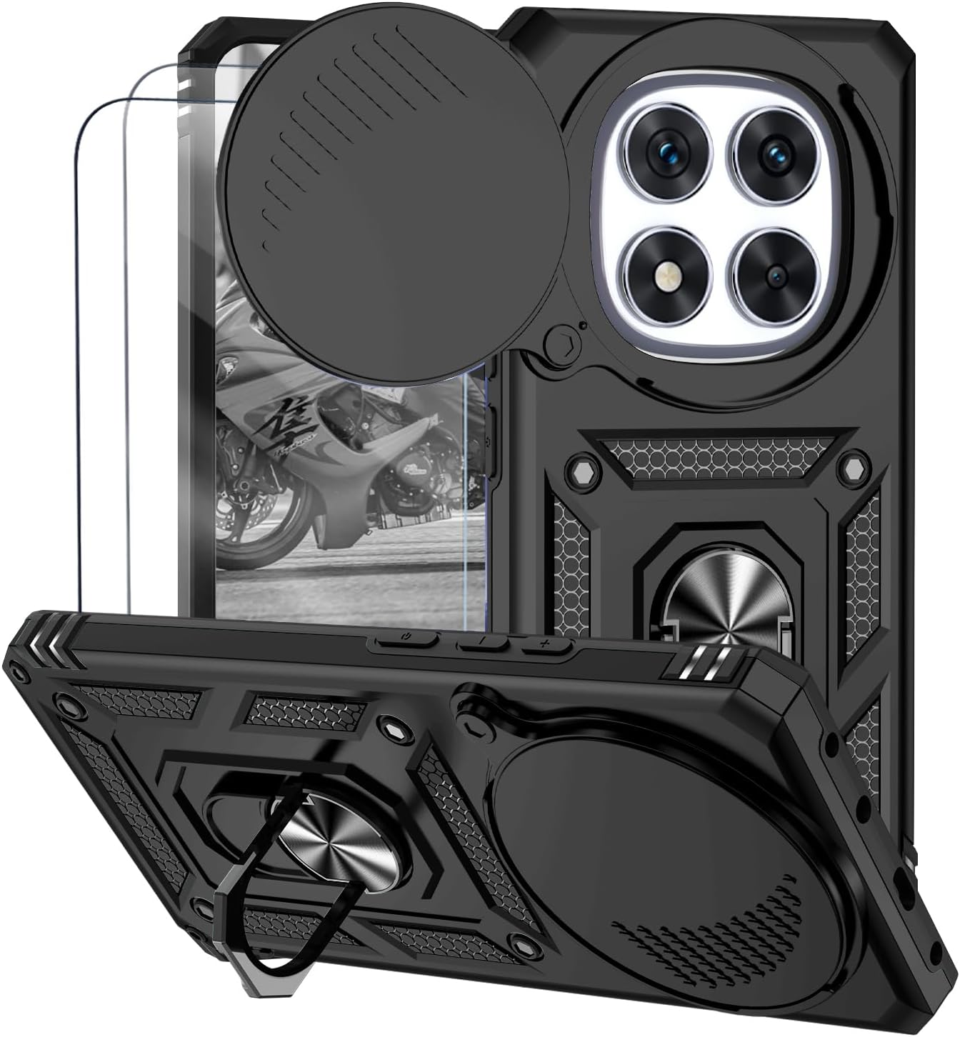 Capa para Xiaomi Poco X7 5G Capinha | com 2 peças de protetor de tela temperado com janela deslizante da câmera e suporte para telefone incluídos – Preto